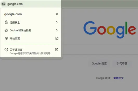 这是Google的官方网站,在这里我们可以看到浏览器地址栏有一个“tune”图标表示这个连接是安全的。同时,我们可以点击这个图标,会跳出一个卡片(也就是图中的那个),显示一些扩展信息,比如“证书”之类。