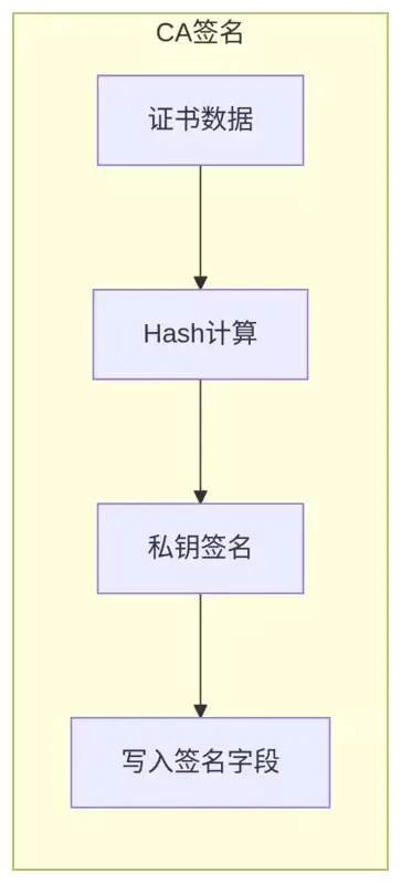 我们可以看到,CA首先计算了证书数据hash并用私钥对其签名,随后将其写入签名域,所以CA的签名在技术上仅仅是一个被CA认证的哈希值,仅此而已。真正有价值的是“这段签名数据是CA用自己的私钥签名的”对这段数据真实性的保证作用,而不是这段签名数据本身。签名的作用是保证数据未被篡改,而不是存储证书信息(毕竟哈希算法不可逆对吧23333)。